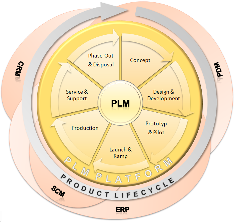 Plattformen für das Lebenszyklusmanagement bilden ein abteilungsübergreifendes Ressourcentool. Auf diese Weise können alle beteiligten Abteilungen (Beschaffung, Entwicklung, Herstellung, Qualitätsmanagement, Marketing usw.) produktbezogene Prozesse für den endgültigen Entwurf genehmigen und überarbeiten. In der Entwicklungsabteilung übergibt die PDM-Plattform die gewünschten Informationen an das PLM-System. Abb. 1 zeigt die Beziehung zwischen PLM, PDM und weiterer integrierter Systeme.