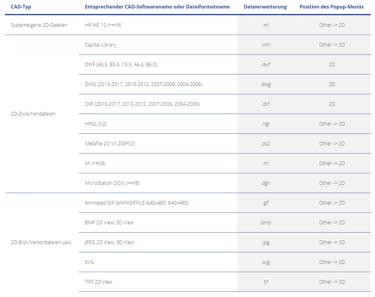 - ein PDF-Dokument mit einer Spezifikationstabelle und einer 2D-Darstellung