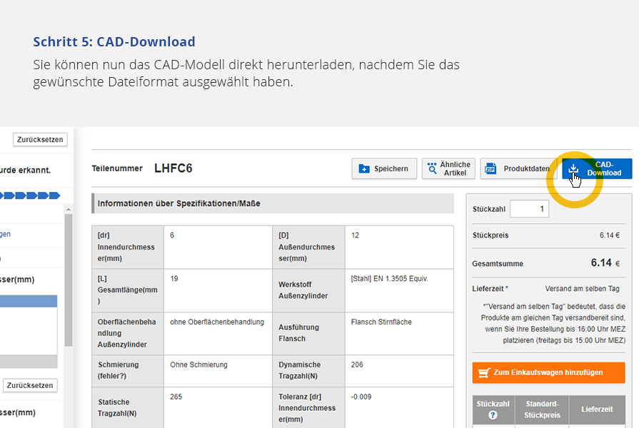Bitte melden Sie sich an: Öffnen Sie die Produktdetail-Seite, indem Sie auf das konfigurierte Teil klicken. Klicken Sie auf den Button "Produktdaten" links neben dem CAD-Download-Button, um auf die Download-Seite zu gelangen. Hier können Sie das gewünschte Dateiformat auswählen und die Daten für Ihr konfiguriertes Teil kostenlos herunterladen. Vor dem Herunterladen können Sie das gewünschte Dateiformat für das entsprechende CAD-Modell auswählen.