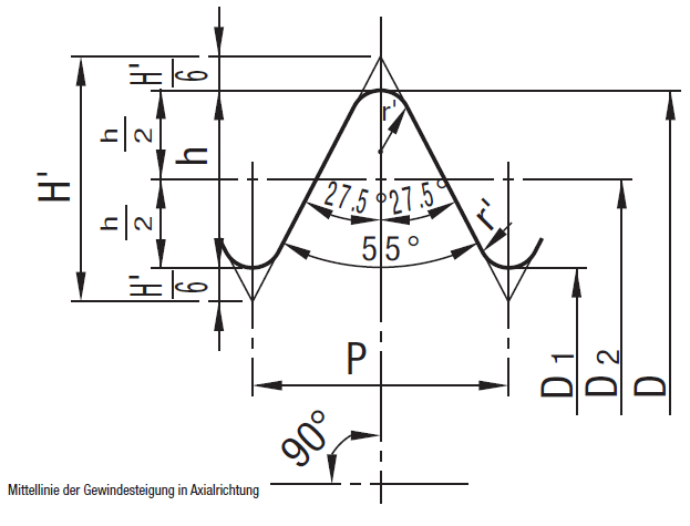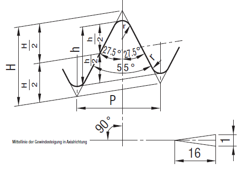 Beachten: Der Nenndurchmesser eines kegelförmigen Außengewindes wird hier angegeben. Bei einem kegelförmigen Innengewinde oder parallelem Innengewinde ist R durch Rc oder Rp zu ersetzten. (Siehe*) Kegelförmiges Gewinde: Länge von Position des Lehrdorndurchmesserpunkts zu einem Mindestdurchmesserpunkt. Paralleles Innengewinde: Länge vom Rohr- oder Rohranschlussende.