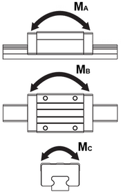 Herstellerseitig werden zu jeder Profilschienenführung die zulässigen statischen Momente der drei möglichen Drehachsen angegeben. Diese können je nach Hersteller unterschiedlich benannt sein. Misumi verwendet für die Angabe dieser Momente die Bezeichnungen MA, MB und MC.